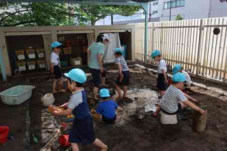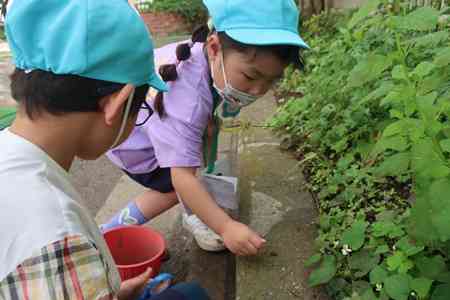 おはようございます。 昨日はよい天気でした。砂場では、水を使い、裸足で砂の感触や水の冷たさ等を存分に味わっていました。担任の先生も「来たよ~」と言いながら一緒にこどもたちと裸足で遊んでいます。こどもたちは、待ってました!という感じでにこにこしています。横の方では、ダンゴムシ探しに夢中の2人がいました。草の中を覗くと、いるいる!「これはメスだね」「おっ、なめくじもいた!」と指先を使って上手く確保しているのには感心します。指先の力の入れ方も大事です。(ダンゴムシをつまむって結構難しいのです)こどもたちが自分のしたいことを十分できる環境を大事にしていきたいと思います。 よい一日を【添付ファイル】
