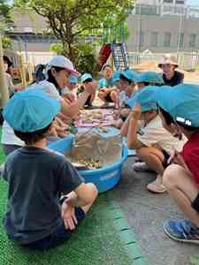 おはようございます。 昨日は、年長組が自分達が育てたジャガイモの収穫をしました。 土嚢袋で育ててきたジャガイモです。なんと、155個収穫できました。私がびっくりしたのは、収穫数をクラスのみんなで数えていたことです。担任が1個ずつジャガイモを手にもち、タライに入れていきます。こどもたちも「1,2、3・・・」と一緒に数えています。100という数字が読み上げられると、自然にみんなから拍手が出ました。そして、残りのジャガイモの数がいくつあるかを、予想し始め、「120個くらいはあるんじゃない」「もっとあるかも」などと、つぶやいている姿が見られました。最後まで、みんなでカウントしていたことに拍手です。小さいのから、大きいのまで、合わせて155個。ちなみに、メークインという種類のジャガイモでした。来週、どのように試食するか、相談中です。 よい一日を【添付ファイル】